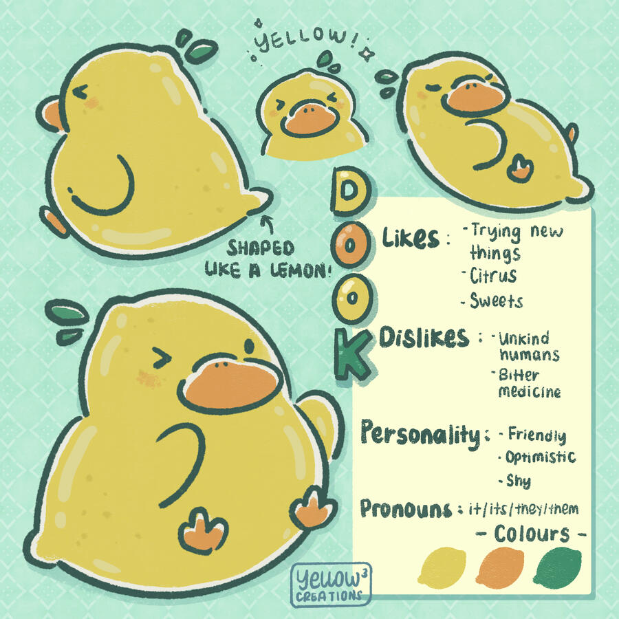 Dook is a curious duck who enjoys trying new things. They're cheerful and optimistic but is strongly protective of its friends. They enjoy drinking a good cup of tea with baked goods, especially ones that are lemon flavoured.Fun fact about Dook: its ambidextrous! They can write/draw with both hands, but prefer its left hand.